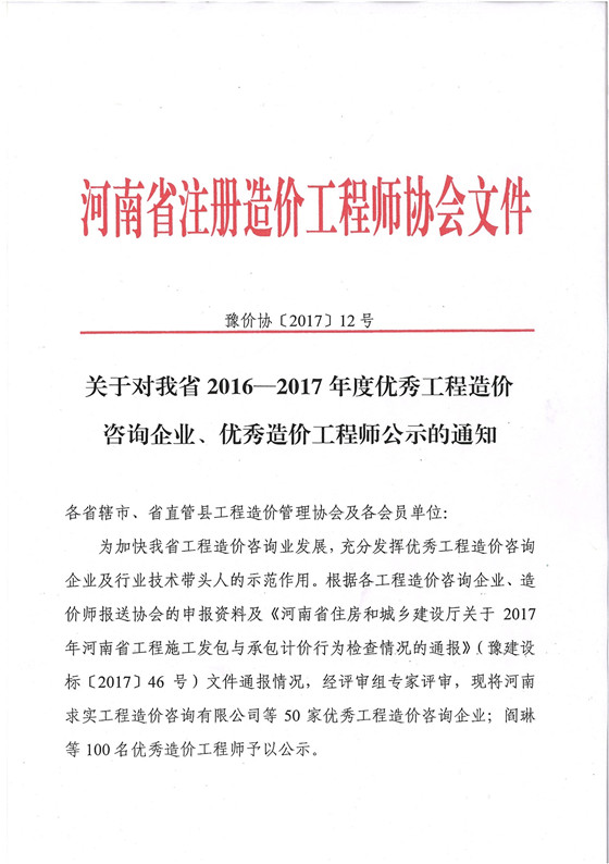 祝贺“河南省鑫诚工程管理有限公司”荣获“省2016----2017年度优秀工程造价咨询企业、“付青坡、马国蛟、刘珊珊、宋喜玲”荣获“优秀造价工程师”称号。